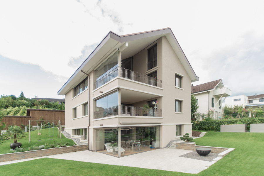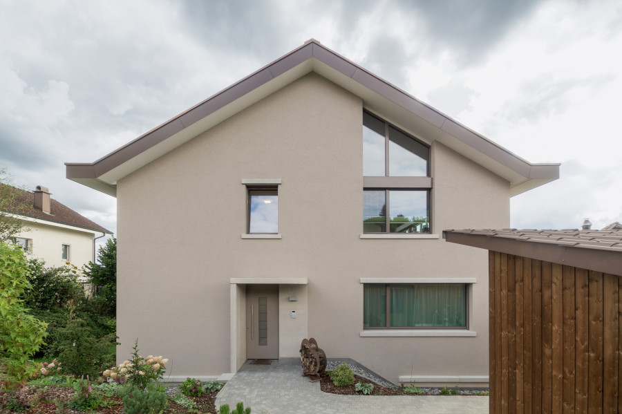 Das Haus ist als robustes Zweischalenmauerwerk konzipiert und setzt auf eine klare, schnörkellose Architektursprache: tragfähige Konstruktion, logisch organisierte Grundrisse und eine zurückhaltende Materialwahl, die sich selbstverständlich in das Quartier einfügt. Die beiden Wohnungen sind so angeordnet, dass kurze Wege, gute Belichtung und ein sinnvoller Bezug zu privaten Aussenbereichen entstehen; die Lochfassade ordnet die Öffnungen präzise und wahrt dabei den ruhigen Gesamteindruck des Baukörpers. Das Satteldach schliesst die Volumetrie ortsüblich ab und unterstreicht den unaufgeregten Charakter des Hauses. In der Summe entsteht ein kleines, dichtes Wohnhaus, das zeigt, wie sich Qualität auch im Einfachen verlässlich umsetzen lässt.