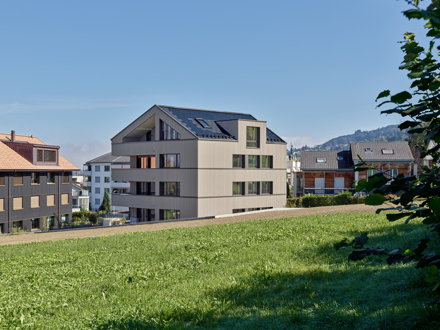 Ein kompaktes Mehrfamilienhaus mit vier grosszügigen Mietwohnungen schliesst den Siedlungsrand von Root zur Landschaft ab. Lukarnen prägen die Dachsilhouette, Balkone und Sitzplätze öffnen die Wohnungen zum Grünraum; die Lage bietet Weitblicke bis zum Pilatus. Grundrisse und Erschliessung sind einfach organisiert und auf den Alltag ausgelegt.