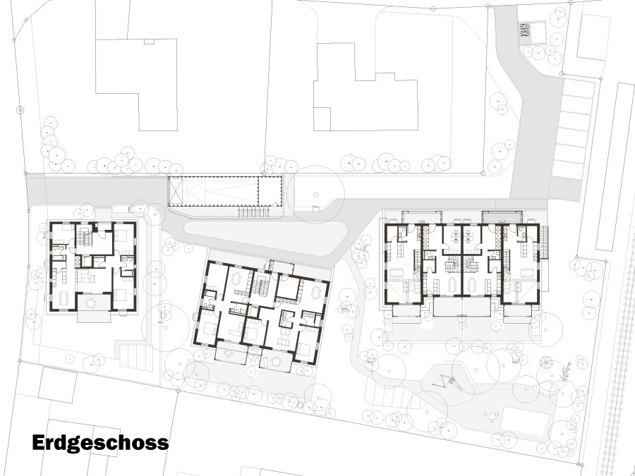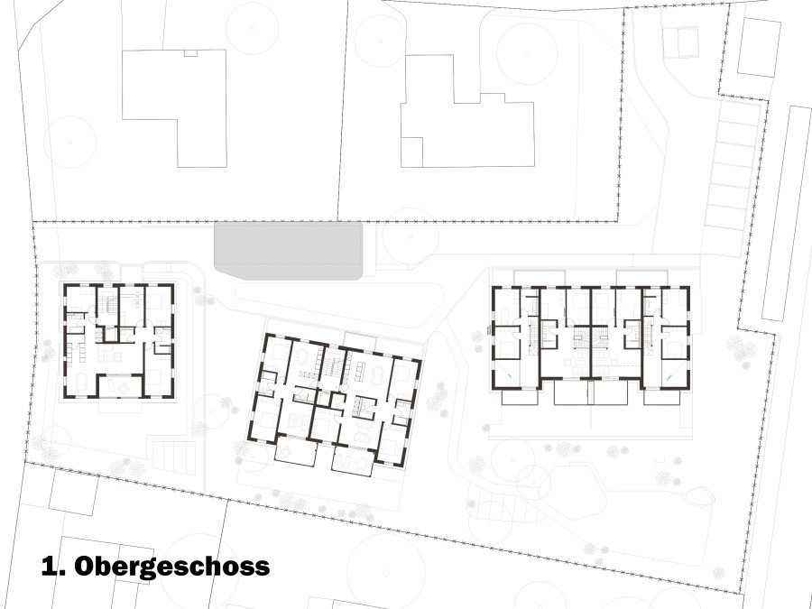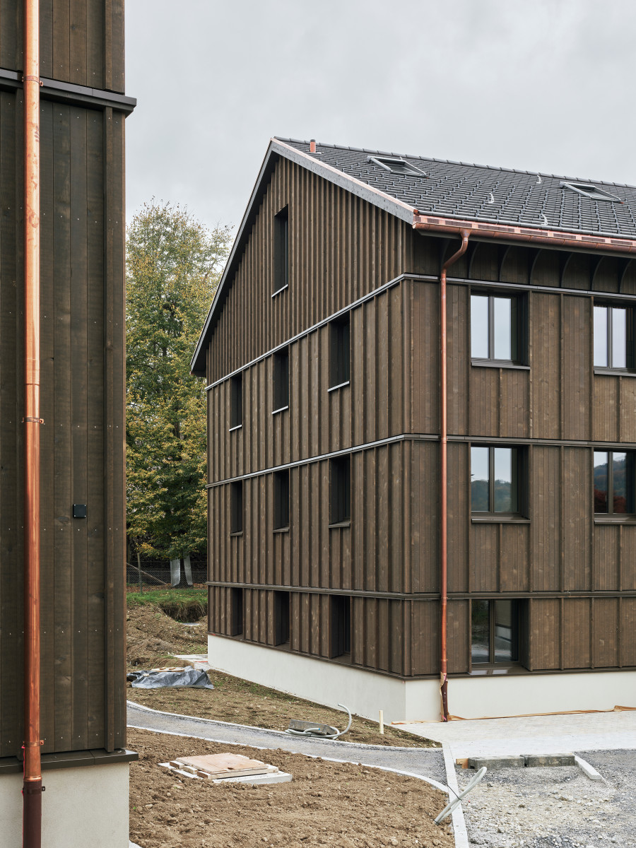 Der Standort liegt am Rand des historischen Dorfkerns und in unmittelbarer Nähe zum Aabach. Die Setzung der Gebäude orientiert sich am gewachsenen Ortsbild (ISOS) und hält die Volumen kompakt, sodass zwischen den Häusern übersichtliche Wege und Aufenthaltsbereiche entstehen.