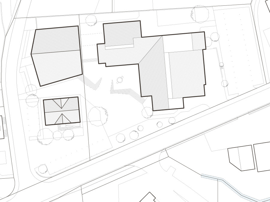 Ausgangspunkt ist der respektvolle Umgang mit dem historischen Hauptbau. Der neue Baukörper ordnet sich in Höhe und Setzung dem Bestand unter, nimmt in seinem Winkel die Ausrichtung der Schulbauten auf und führt Besucher entlang der Ambarstrasse selbstverständlich in Richtung Areal. Mit der erneuten Adressbildung über die Südseite gewinnt das Gemeindehaus seine klare Präsenz im Ort zurück.