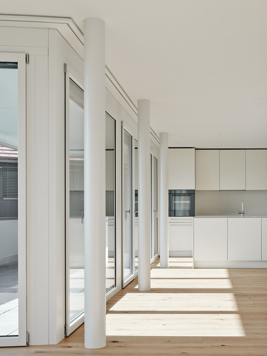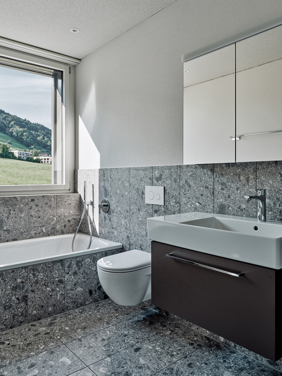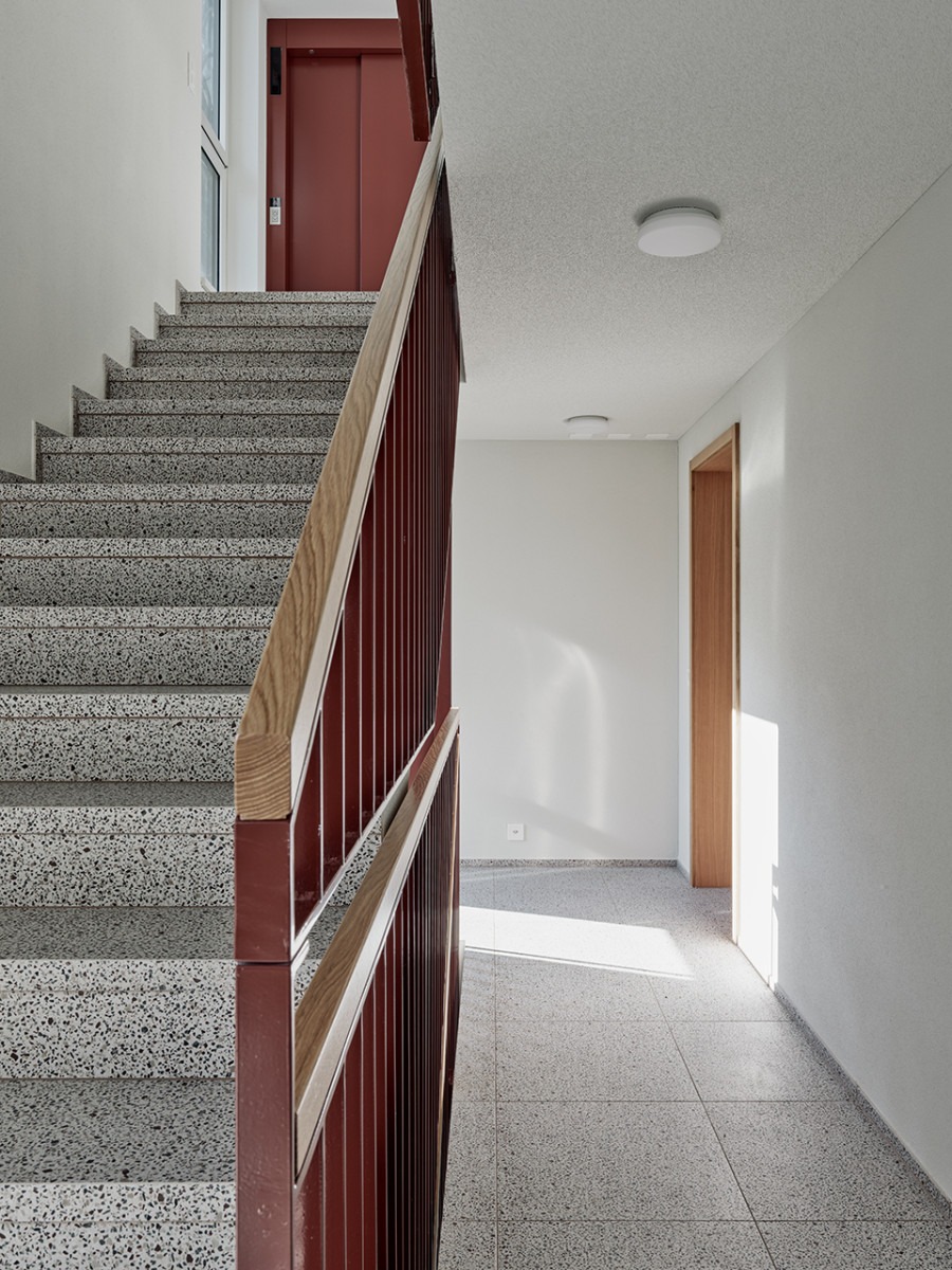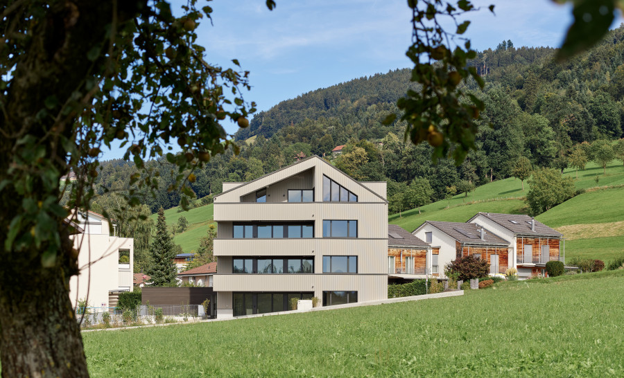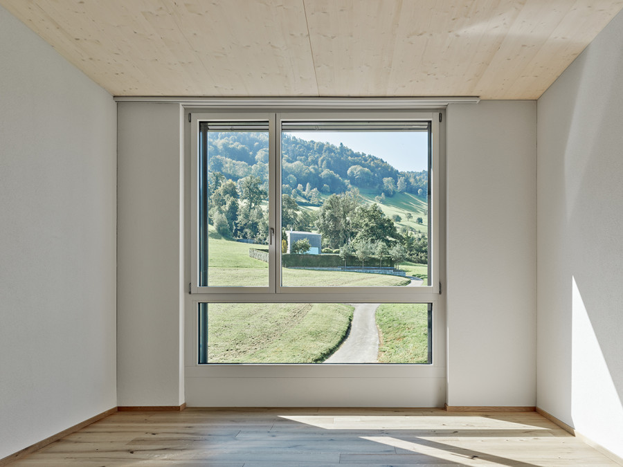 Das Haus steht in einer naturnahen, gut erschlossenen Situation zwischen Wohnquartier und Naherholung; es ergänzt die bestehende Struktur, ohne sich in den Vordergrund zu spielen, und hält mit seiner ruhigen Fassadengliederung Mass und Nachbarschaft. Jede der vier Wohnungen ist grosszügig geschnitten, hell belichtet und verfügt über einen gut nutzbaren Aussenbereich, der den Wohnraum funktional erweitert.